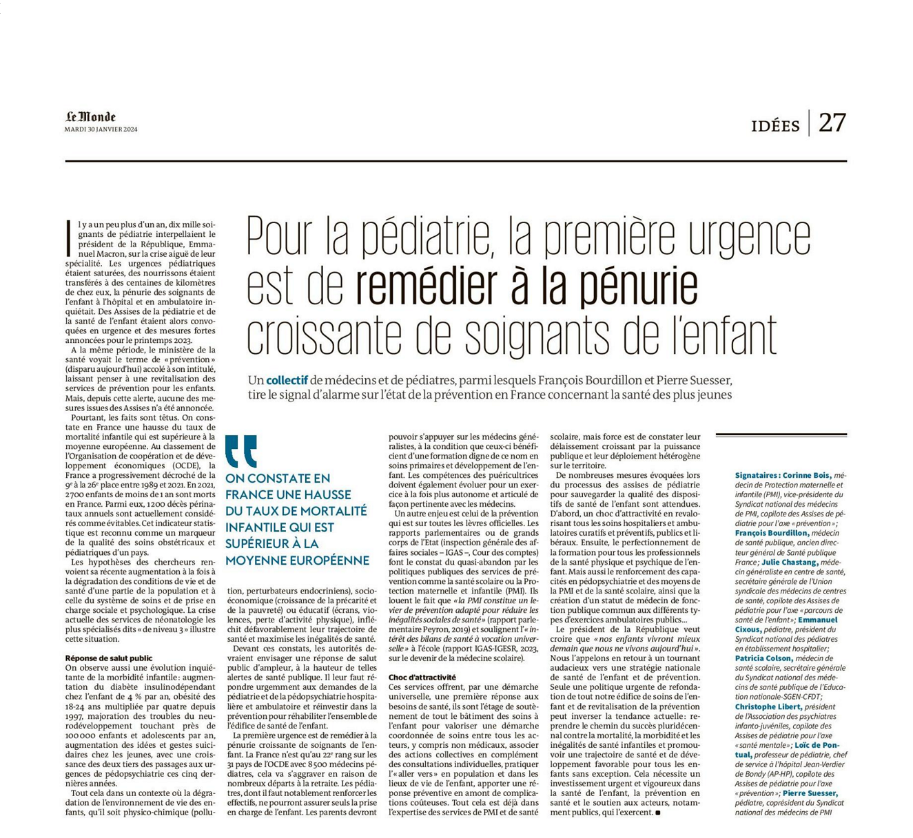"Pour la pédiatrie la première urgence est de remédier à la pénurie croissante de soignants de l’enfant"